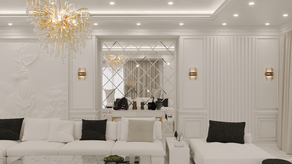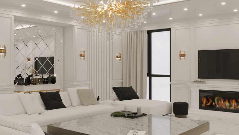 This residence, completed in 2024, was designed in a modern neoclassical style that balances timeless elegance with contemporary comfort. The space features classic architectural detailing, such as wall paneling and cornices, paired with minimalist furniture, sleek lighting, and refined finishes. A warm neutral palette, combined with glossy surfaces and gold accents, enhances the sense of luxury without overwhelming the space. The open-plan layout connects the kitchen, dining, and living areas seamlessly, while large windows allow natural light to emphasize the crisp lines and textures throughout. Custom elements like the built-in wine bar, double chandeliers, and marble island add personality and sophistication, making the space both functional and visually striking. Designed for modern living, this home offers a calm yet upscale atmosphere tailored to the client’s lifestyle.